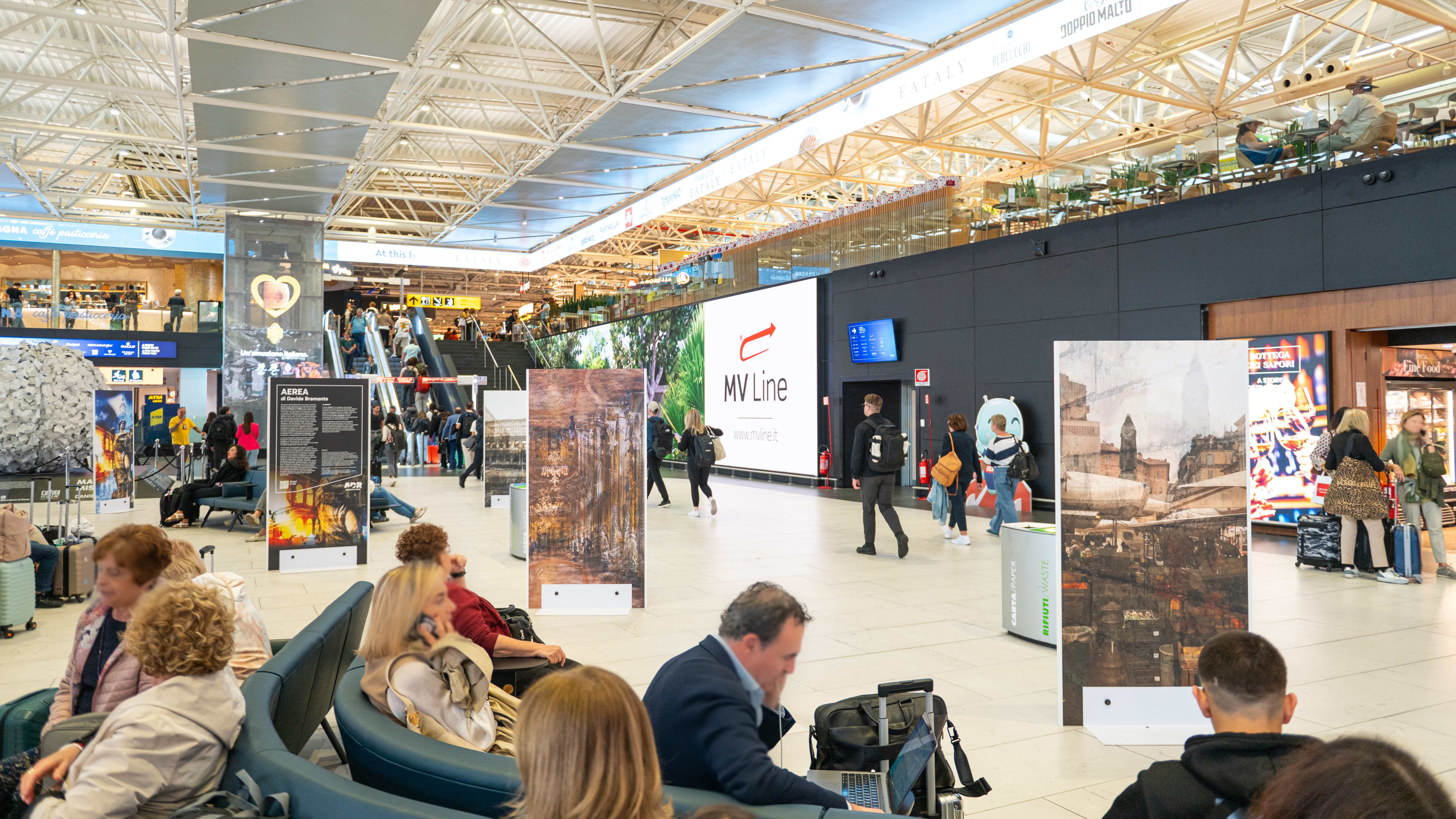 Amid the architectures of Fiumicino’s Terminal and, at Ciampino, within the spaces of General Aviation, Bramante’s works accompany travellers on a visual journey suspended between lightness and memory, between lived cities and imagined ones.