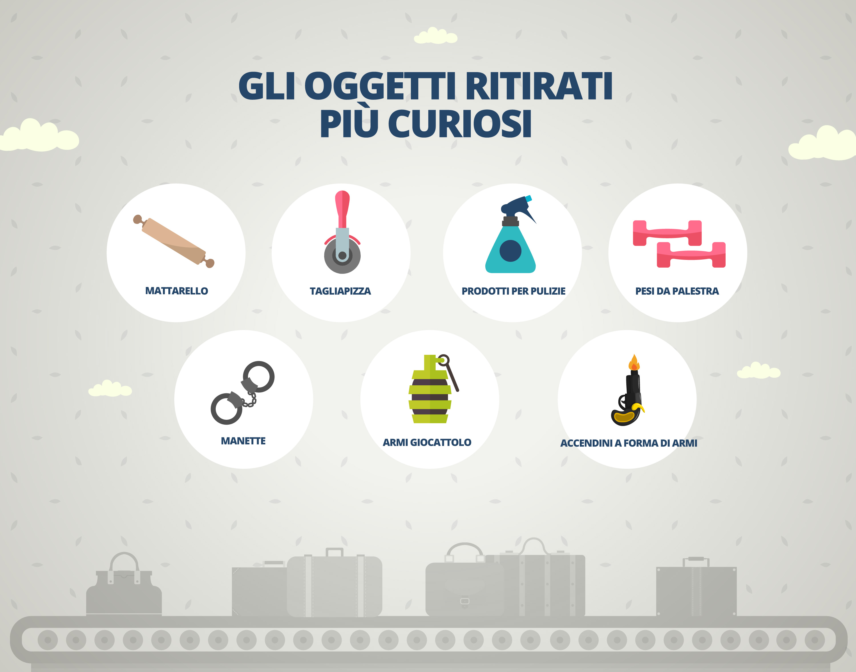 Prima di effettuare il check-in, il passeggero è invitato a liberarsi, in un’area appositamente adibita, di tutti quegli oggetti che, nel rispetto dell’attuale quadro normativo vigente e secondo le norme fondamentali sulla sicurezza, non sono ammessi all’interno dell’aeromobile. Si tratta di liquidi, aerosol e gels (L.A.G.S.*) e oggetti non ammessi in cabina (O.N.A.C.).